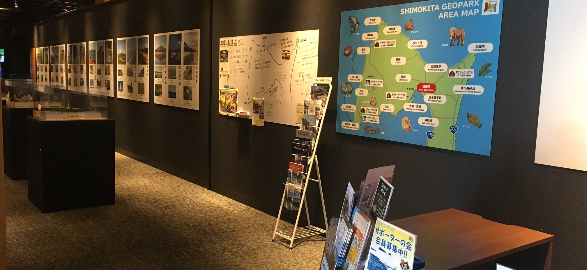 下北ジオパークの見どころが詰まったパネル、ジオラマ、実際に触れて感じることができる岩石標本などがあります。