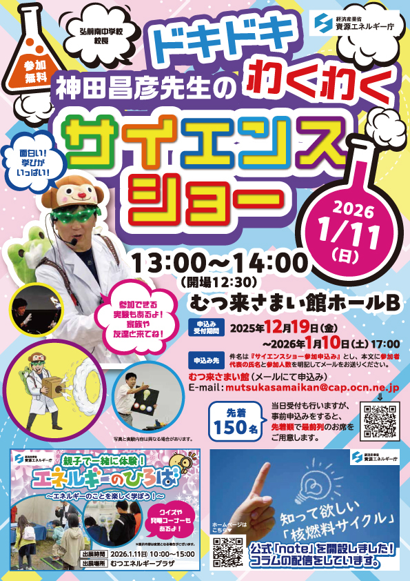 件名は『サイエンスショー参加申込み』とし、本文に代表者の氏名と参加人数を明記してmutsukasamaikan@cap.ocn.ne.jpまでお送りください。